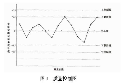 质量控制图是对检测过程的质量加以测量、记录并进行极值管理的一种用统计方法设计的图,可用于观察分析连续测定所得到的数据。编制质量控制图的基本假设是检测结果在受控的条件下具有-定的精密度和准确度,且按正态分布。质控图上有中心线、上、下警告线和上、下控制线,并有按检测顺序抽取的样本统计值的描点序列,参见图1。